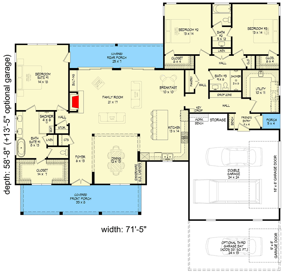 A separate Friend’s Entry and small porch offer a more private way for family or close friends to come in, leaving the main foyer ready for formal guests. This adds flexibility to how you welcome people home.