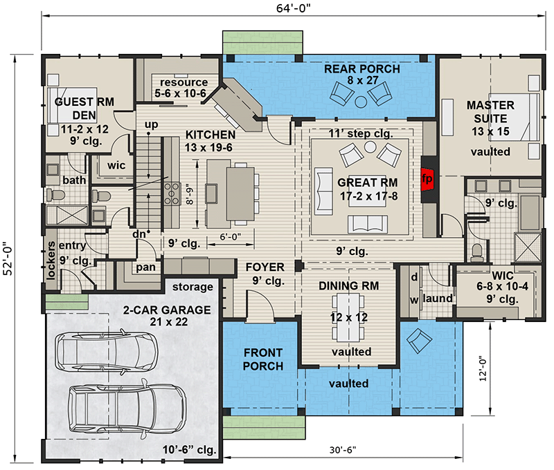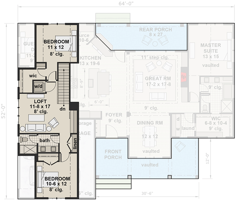 The rear porch truly connects indoor and outdoor living. With space for both dining and lounging, it naturally extends the great room and kitchen.
