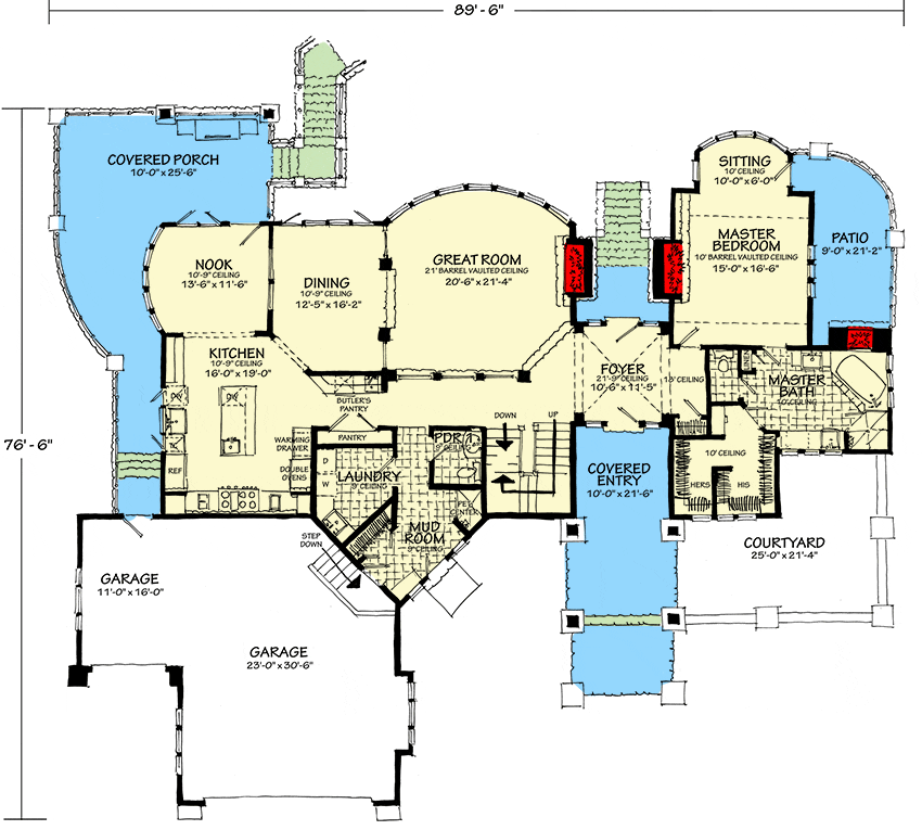 When you step into the great room, you’ll notice the impressive 21-foot barrel-vaulted ceiling. This space is truly the heart of the home.