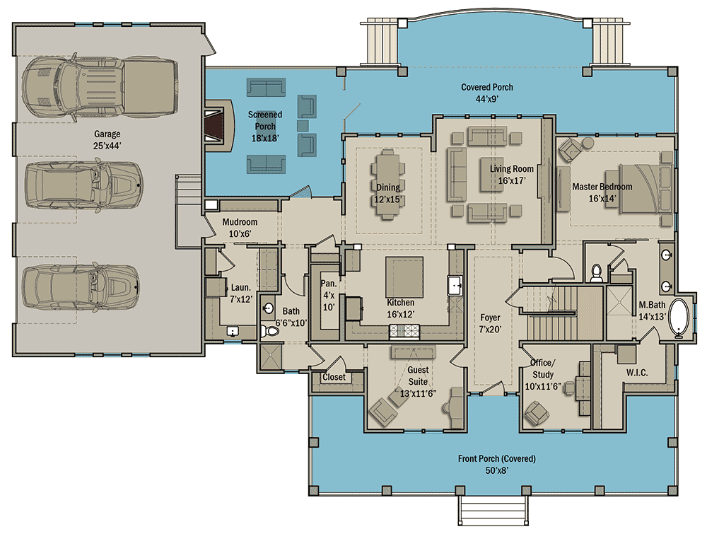 Walk out from the living room and you’re on the covered rear porch. It stretches 44 feet across the back of the house and offers an unbeatable view of the backyard and pool area.