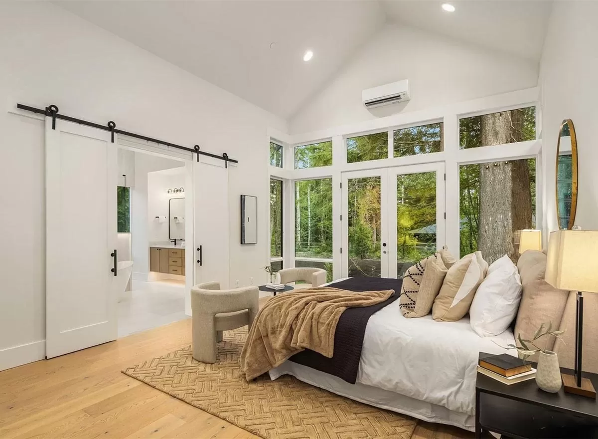 Situated on the main floor, the master suite is a private retreat. Boasting vaulted ceilings and French door access to the outside, the room feels both expansive and intimate. The five-fixture bath further amplifies the luxury. This space is ideal if you desire tranquility and convenience, as you won’t need to navigate stairs daily.
