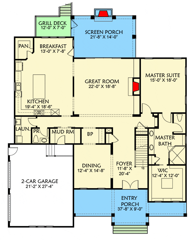 On the main floor, the master suite (15′ by 18′) provides a private retreat.