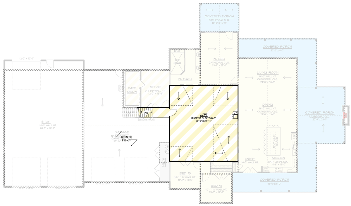 Heading into the garage wing, the shop stands out with its generous size and tall ceilings.