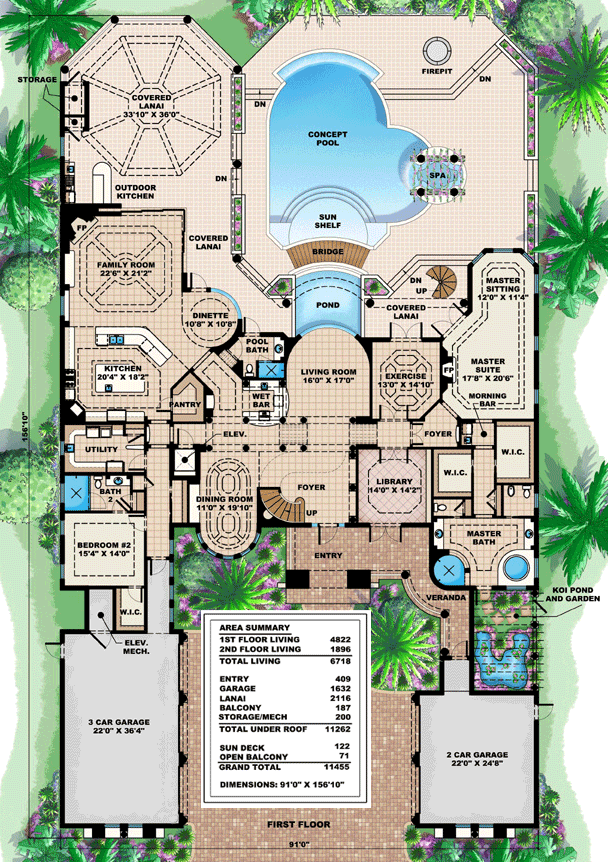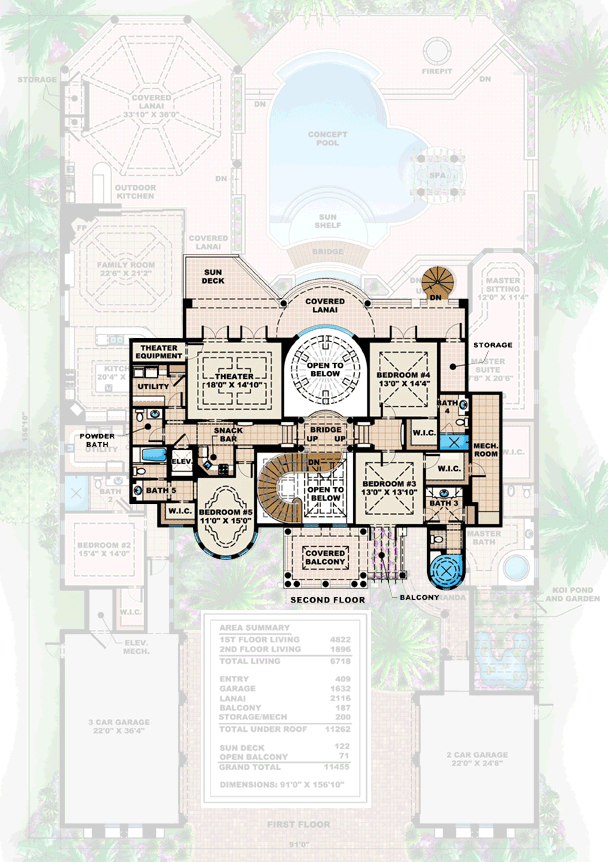 A covered lanai stretches along the back of the second floor, with a sun deck extending from it. This is a great spot for morning yoga or evening drinks while taking in the backyard oasis.