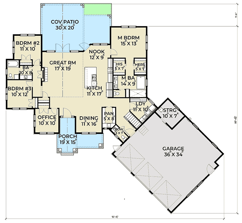 Let’s talk about the garage, because it stands out from the usual. This 36 by 34 foot space fits three cars, plus leaves plenty of room for bikes, lawn equipment, or even a workshop.