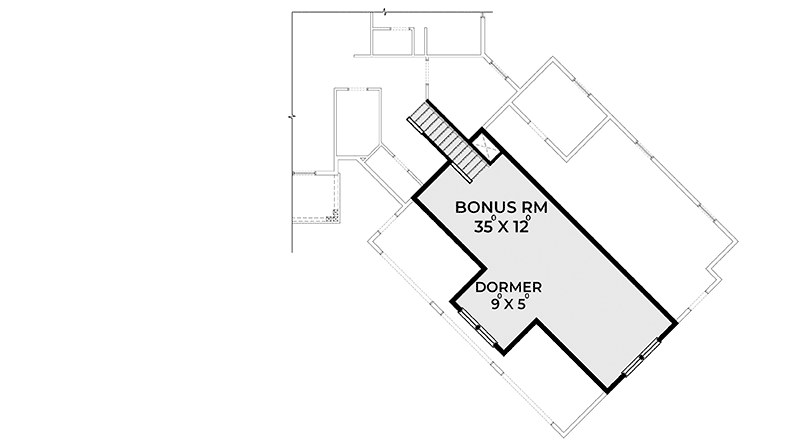 Off to one side of the bonus room, a 9 by 5 foot dormer alcove provides a perfect spot for a reading nook, cozy desk, or display shelves.