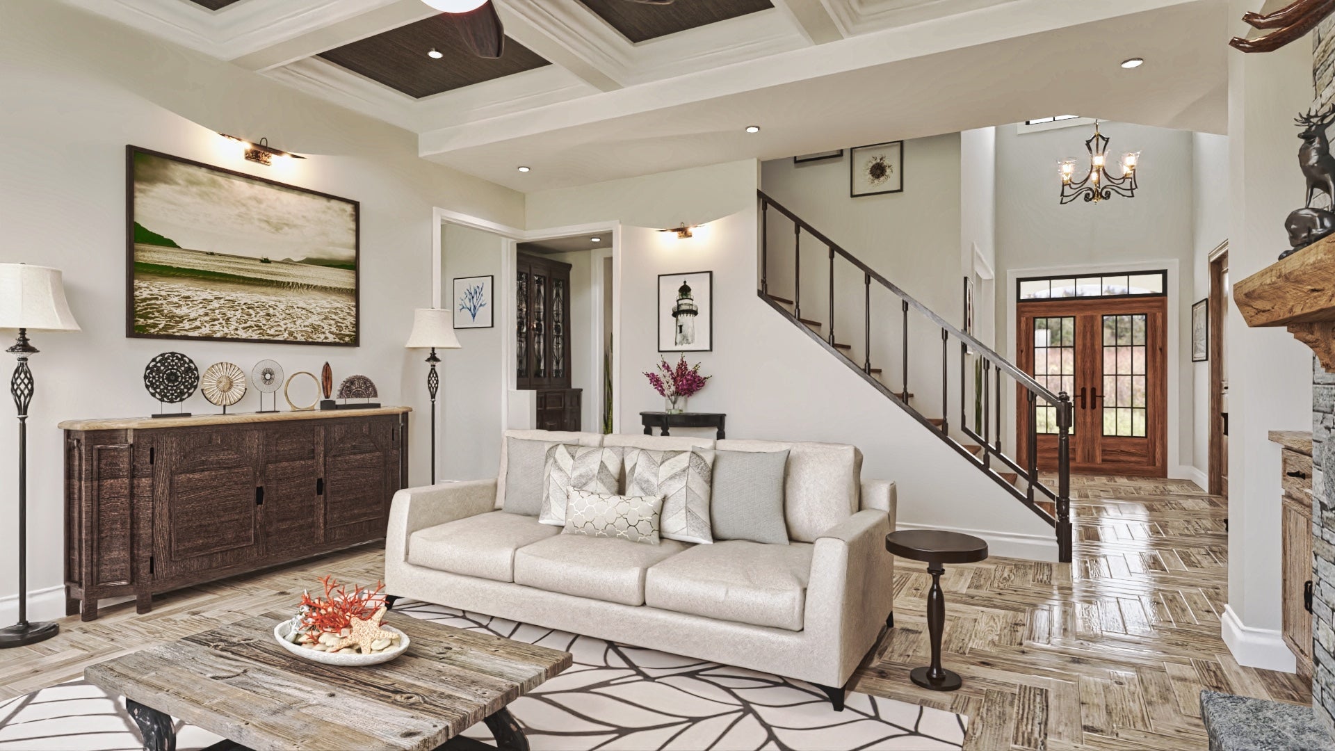 The coffered ceiling is an elegant feature that adds character to the room, and I think it really elevates the space.