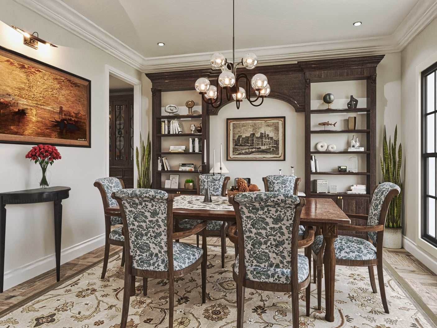 Its proximity to both the kitchen and foyer makes it perfect for both formal meals and casual gatherings. You’ll notice it has easy access to the kitchen through a convenient butler’s pantry, making serving a breeze.
