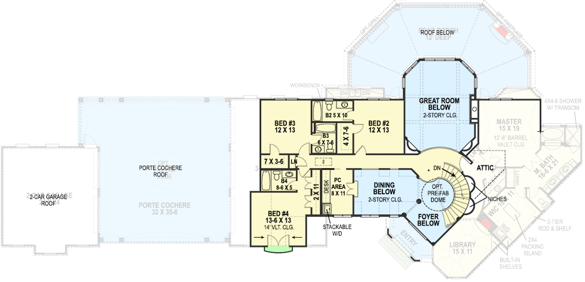 On the right, the attached three-car garage gives you even more parking and includes a workbench for hobbies.