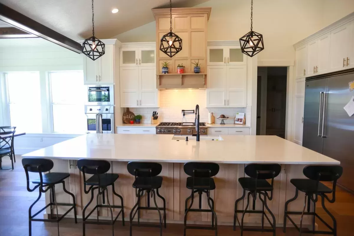 It’s a chef’s dream with a generous island that doubles as a breakfast bar. You’ll have ample counter space and storage, plus a walk-in pantry that’s a must-have for keeping your ingredients organized. I can picture you whipping up some amazing meals here.