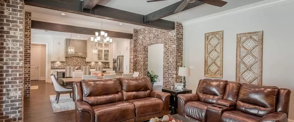 Move over to the formal dining space, embraced by those captivating brick accent walls and timbers. It’s not just a room; it’s a statement of sophistication and warmth, where every meal becomes a special occasion.