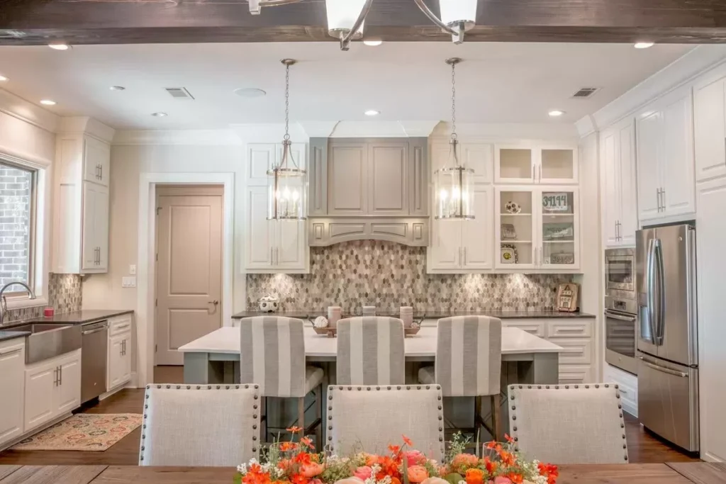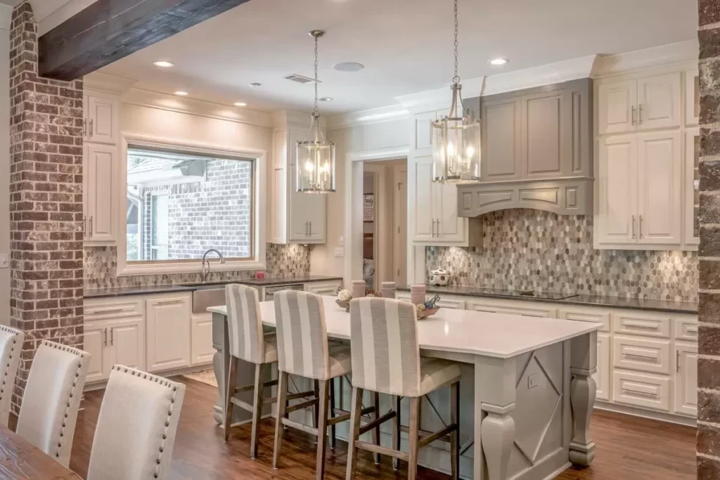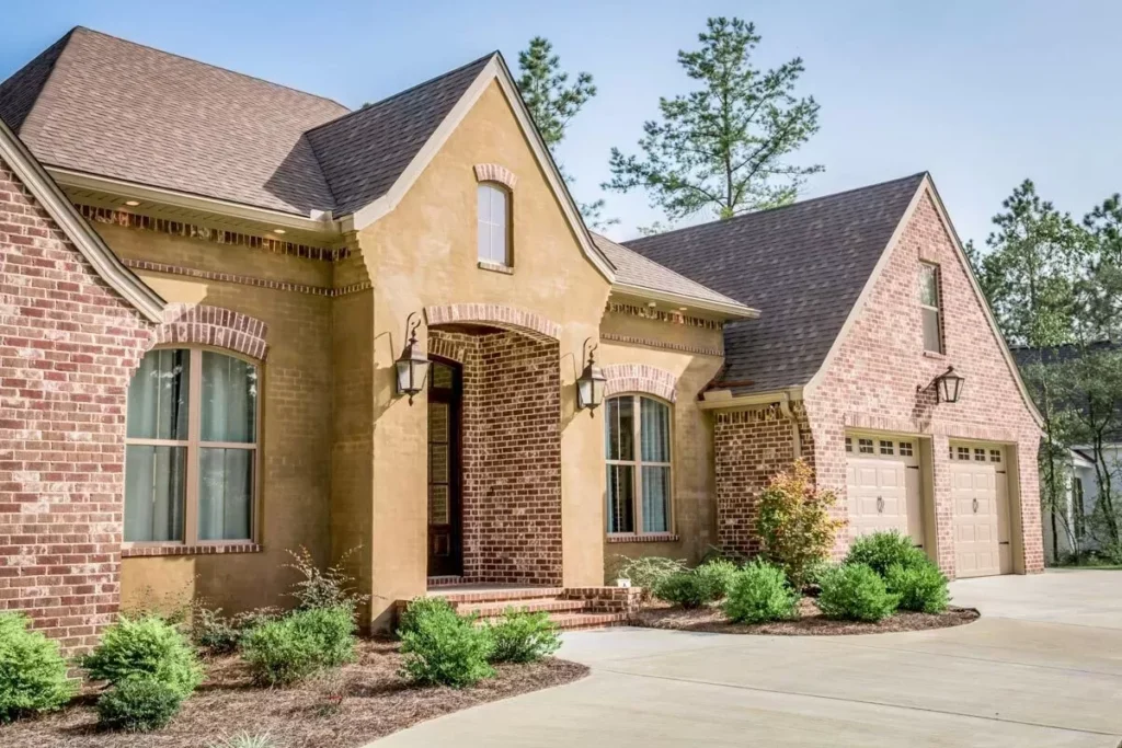As you approach the house, the front porch greets you with its welcoming aura, promising warmth and beauty beyond its doors. This isn’t just any entrance; it’s your preview into a meticulously designed world where brick and stucco blend harmoniously, hinting at the exquisite details awaiting inside.