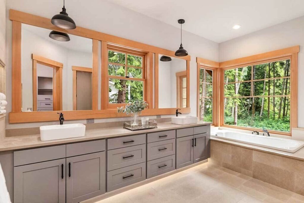 The master suite is a private oasis designed with luxury and relaxation in mind. Situated off to itself, this room features its own fireplace, creating a cozy atmosphere perfect for unwinding after a long day. The large windows and high ceilings add to the sense of serenity and seclusion. It’s a personal retreat that makes every day feel like a spa day.