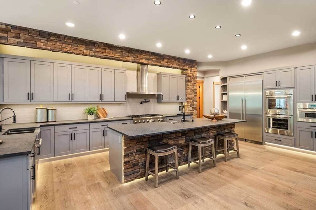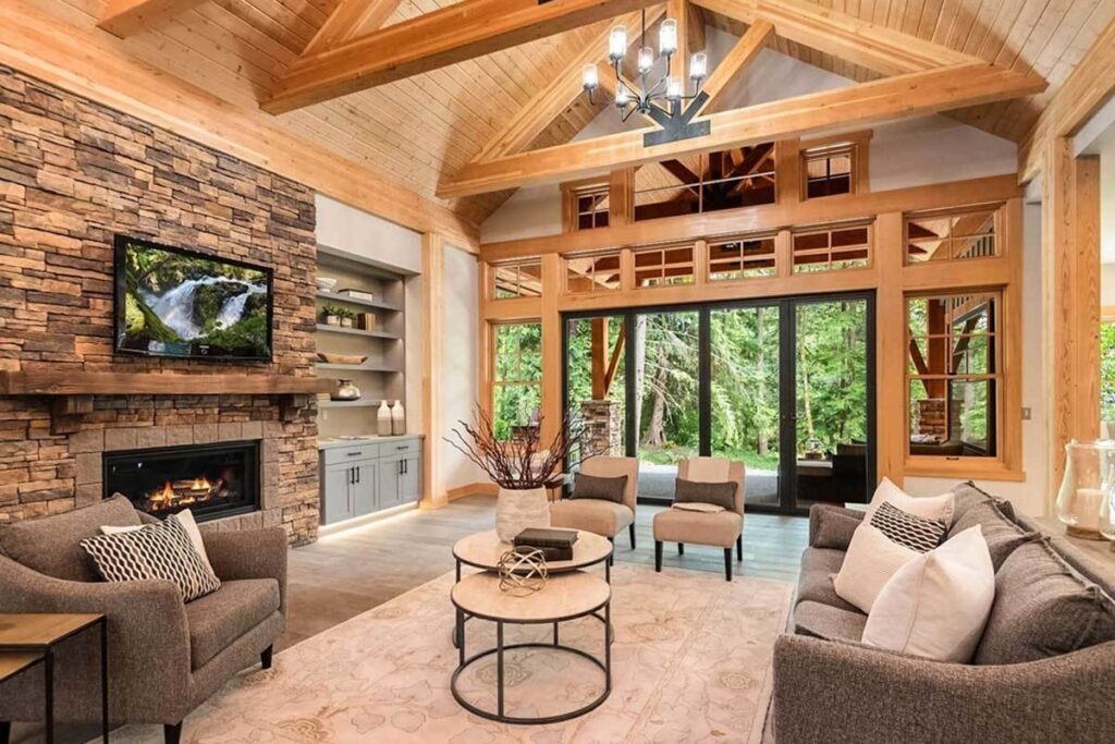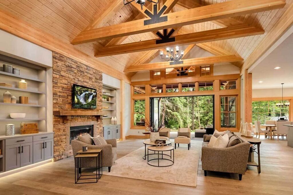 Walking forward from the foyer, the great room unfolds in front of you like a scene from a luxury mountain lodge magazine. The vaulted ceilings with exposed beams elevate the sense of space, and the large windows invite the outside in, allowing you to bask in the beauty of your surroundings. Centered around a cozy fireplace, this room is where memories are made, whether it’s a quiet evening with a book or lively nights hosting friends and family.