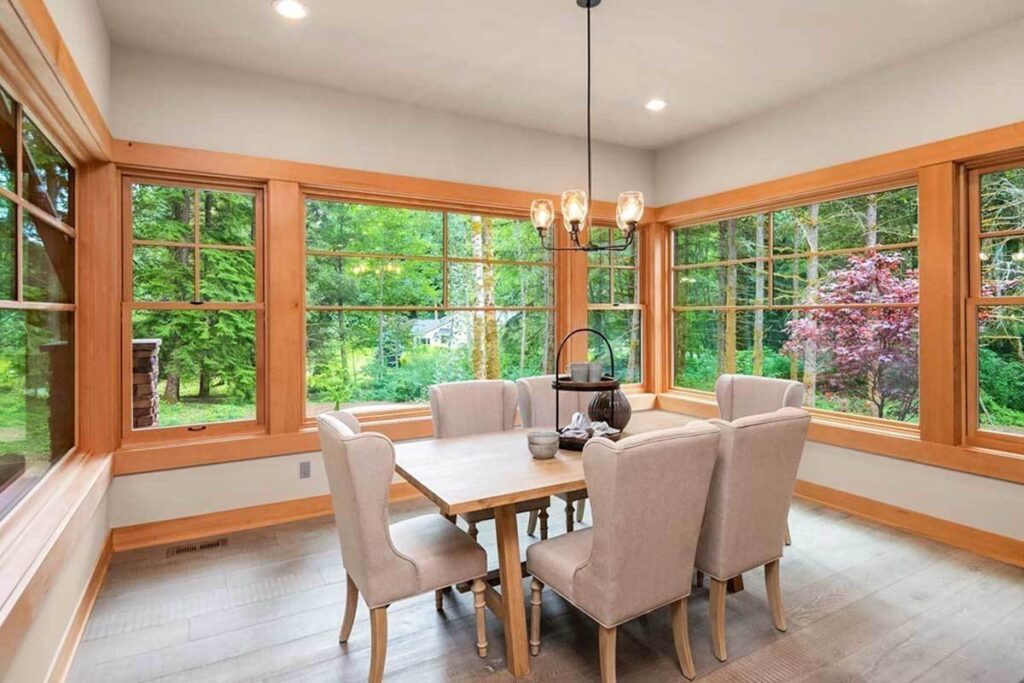 Adjacent to the kitchen, the formal dining room offers a more traditional space for meals. Whether it’s a grand holiday feast or an intimate dinner for two, the setting here is perfect for creating unforgettable dining experiences. The openness of this area to the rest of the living spaces ensures that even formal meals feel inclusive and inviting.