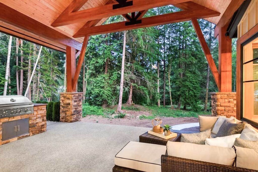 Walking outside, the vaulted outdoor living area echoes the grandeur of the interior. It’s a seamless transition from the comfort of the indoors to the natural beauty of the mountain setting. The outdoor living space, complete with its own vaulted ceilings, is perfect for enjoying fresh air, incredible views, and memorable moments with loved ones, all year round.