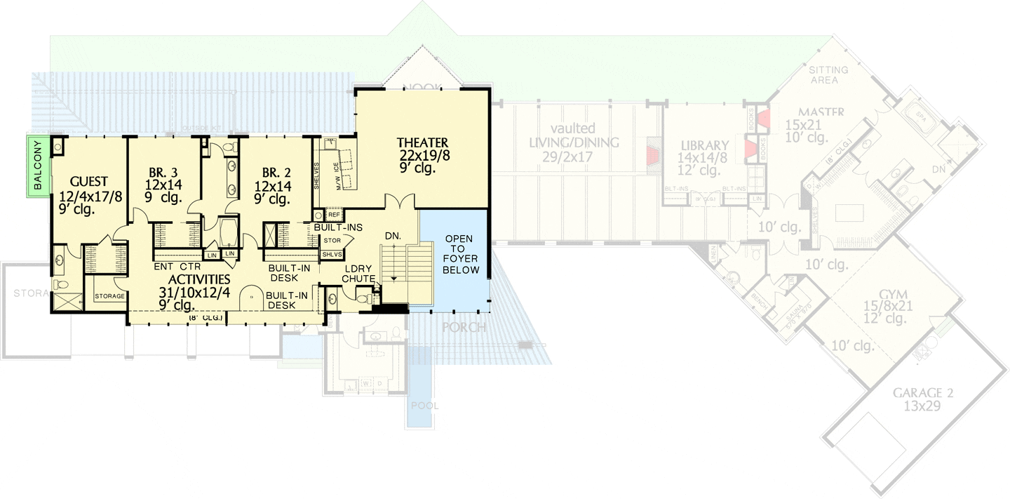 Connected to the bedrooms is the activities area, a versatile open space with built-ins for storage and media. It could serve as a game room, study zone, or anything your imagination allows. Its adaptability truly caters to a variety of needs and lifestyles.