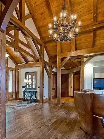 Continue into the great room—truly the heart of this home. With its soaring vaulted ceilings and exposed timbers, it exudes a sense of drama and openness.