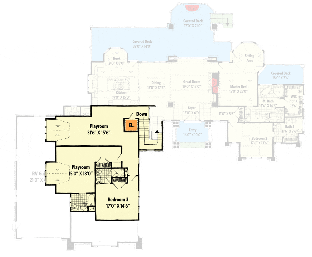 Heading upstairs via stairs or elevator lands you in a Playroom that measures a whopping 31.6 feet by 15.6 feet! It’s like stepping into a wonderland.