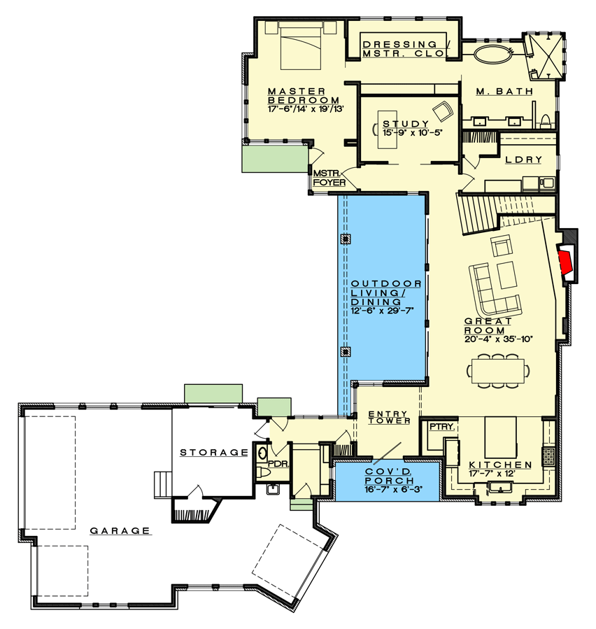 Sliding glass doors lead from the great room to a covered outdoor living and dining area that stretches almost the full length of the house.