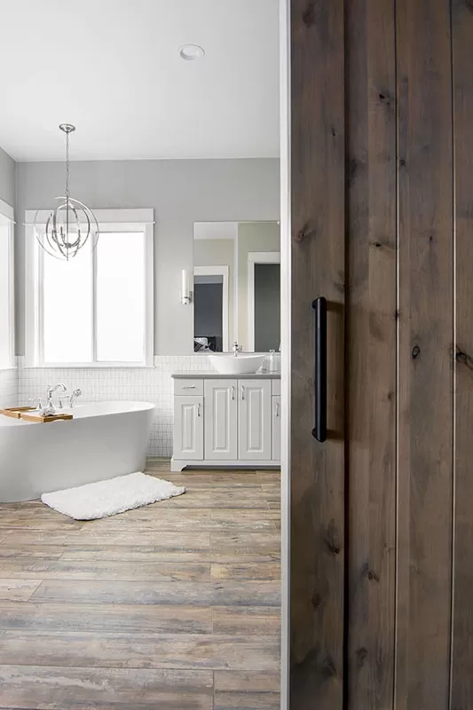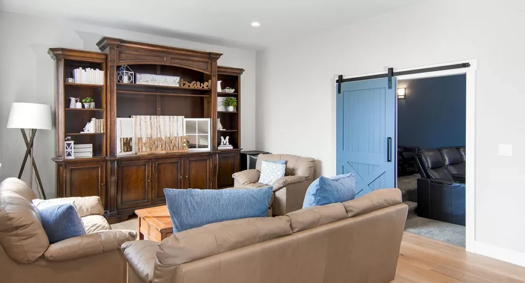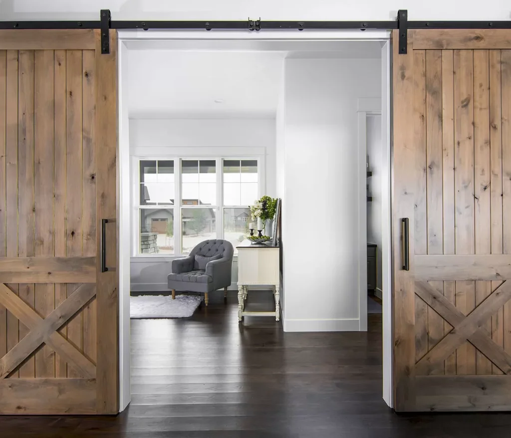 A den, secured behind barn doors, offers a quiet retreat or productive workspace with its own pocket office.
