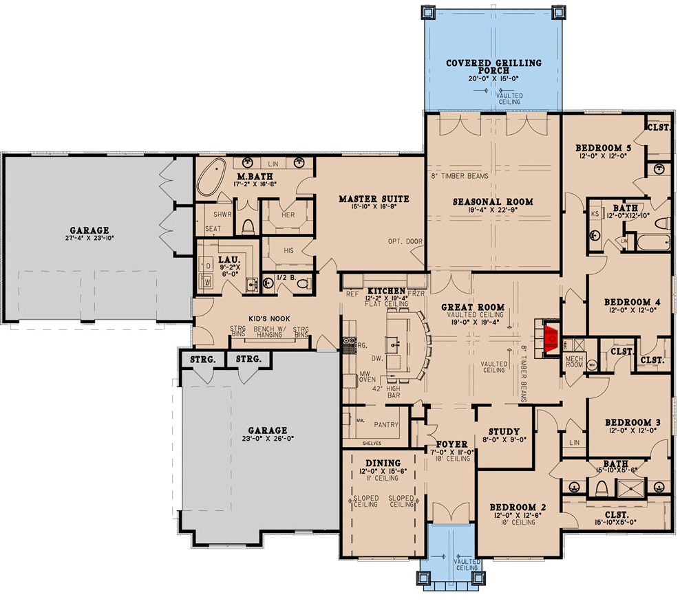 As you walk into the great room, it’s easy to imagine everyone gathering here. The vaulted ceiling with timber beams creates a rustic, open feeling.
