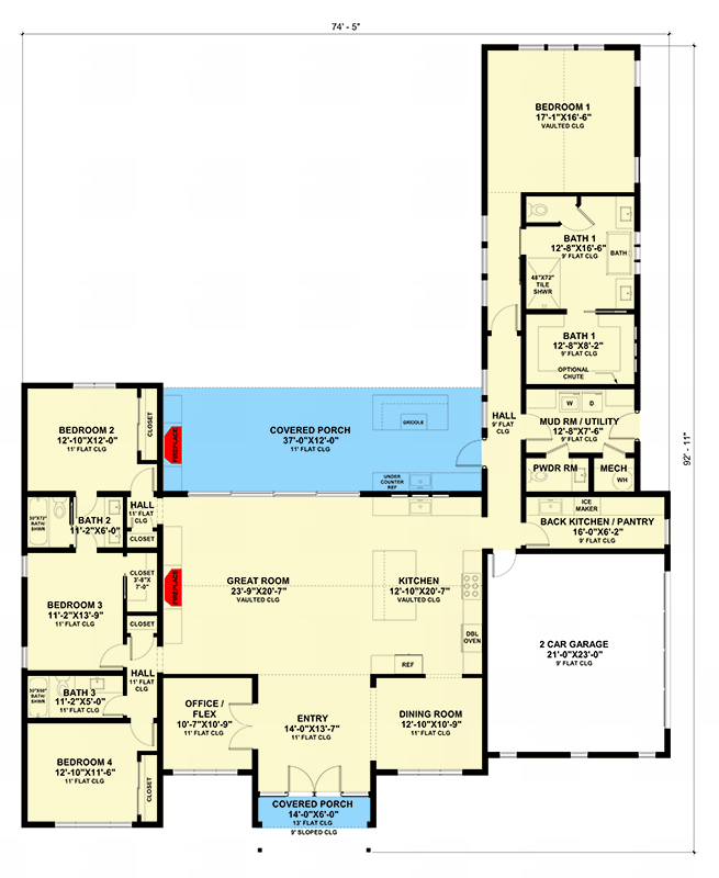 Split Bedroom Modern Ranch House Plan with Vaulted Interior and a Flex Room – 3140 Sq Ft (Floor Plan)