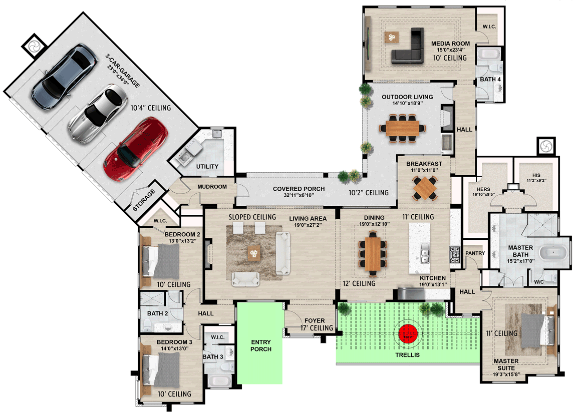 Connecting the media room and the master suite area is a simple hallway. It’s not just a passageway—it acts as a buffer, giving these spaces extra privacy. The home’s layout keeps public and private areas distinct, which I think is a great feature, especially for busy households or frequent guests.