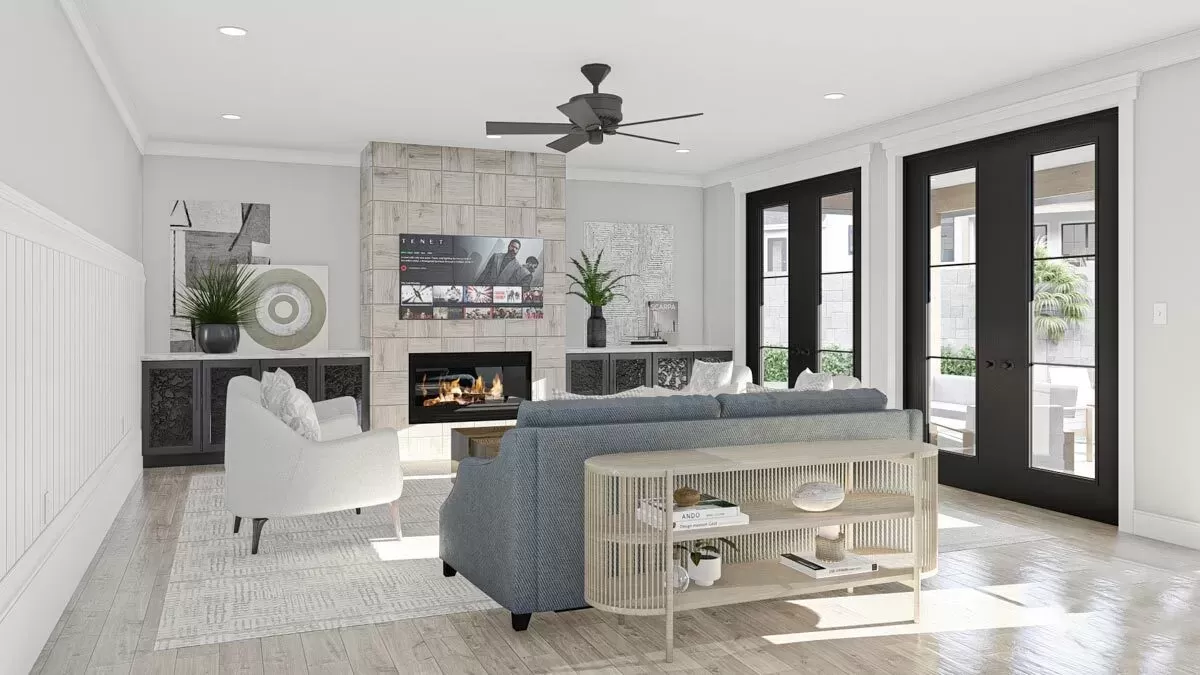 Moving deeper into the home, the open layout of the kitchen and great room strikes me as the centerpiece of this design. The kitchen boasts a farm sink, an island with a snack bar, and a walk-in pantry — ideal for those who love cooking and need ample space. Connected directly, the great room, with its cozy fireplace flanked by built-in cabinets, invites you to unwind and enjoy the warmth.