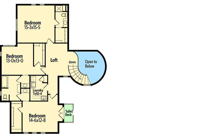 At the top of the plan, the largest upstairs bedroom measures 15-3 x 15-5 and has its own private bath, almost like a mini-suite.