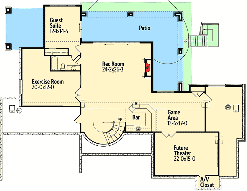Let’s go down to the lower level. The spiral main staircase brings you right into a floor designed for entertainment and relaxation.
