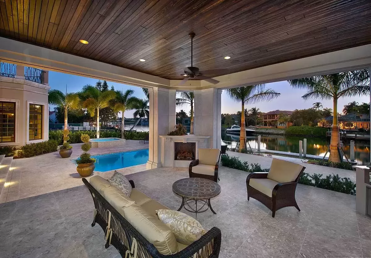 The covered lanai is a standout feature for outdoor enjoyment. Equipped with an outdoor kitchen and overlooking the pool deck, this area is perfect for alfresco dining or entertaining.